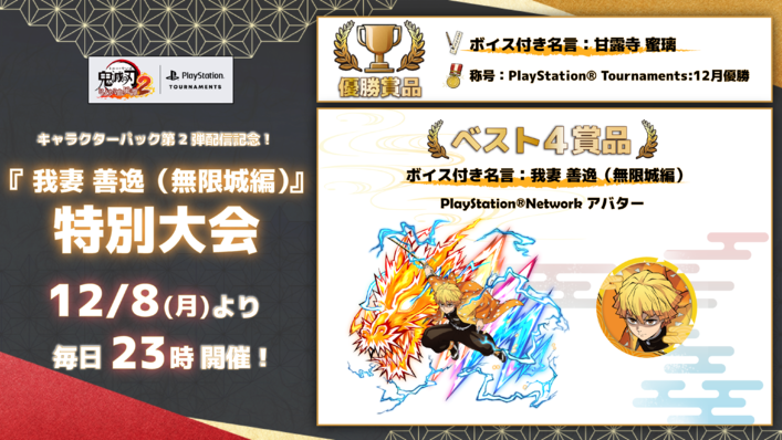 『我妻 善逸(無限城編)』特別大会も23時から追加で開催されます。ベスト4に入ればボイス付き名言など豪華賞品が獲得できるので、奮ってご参加ください!